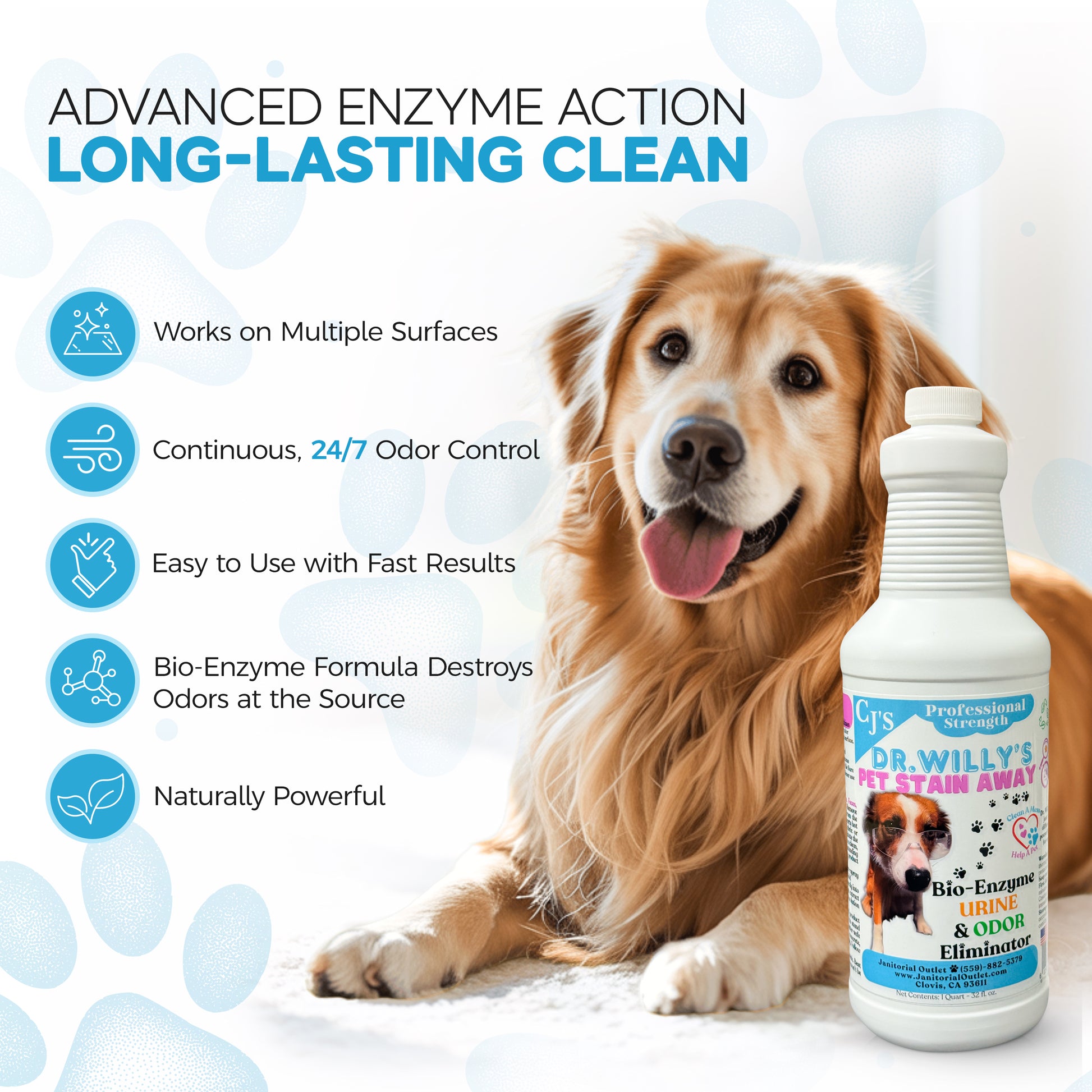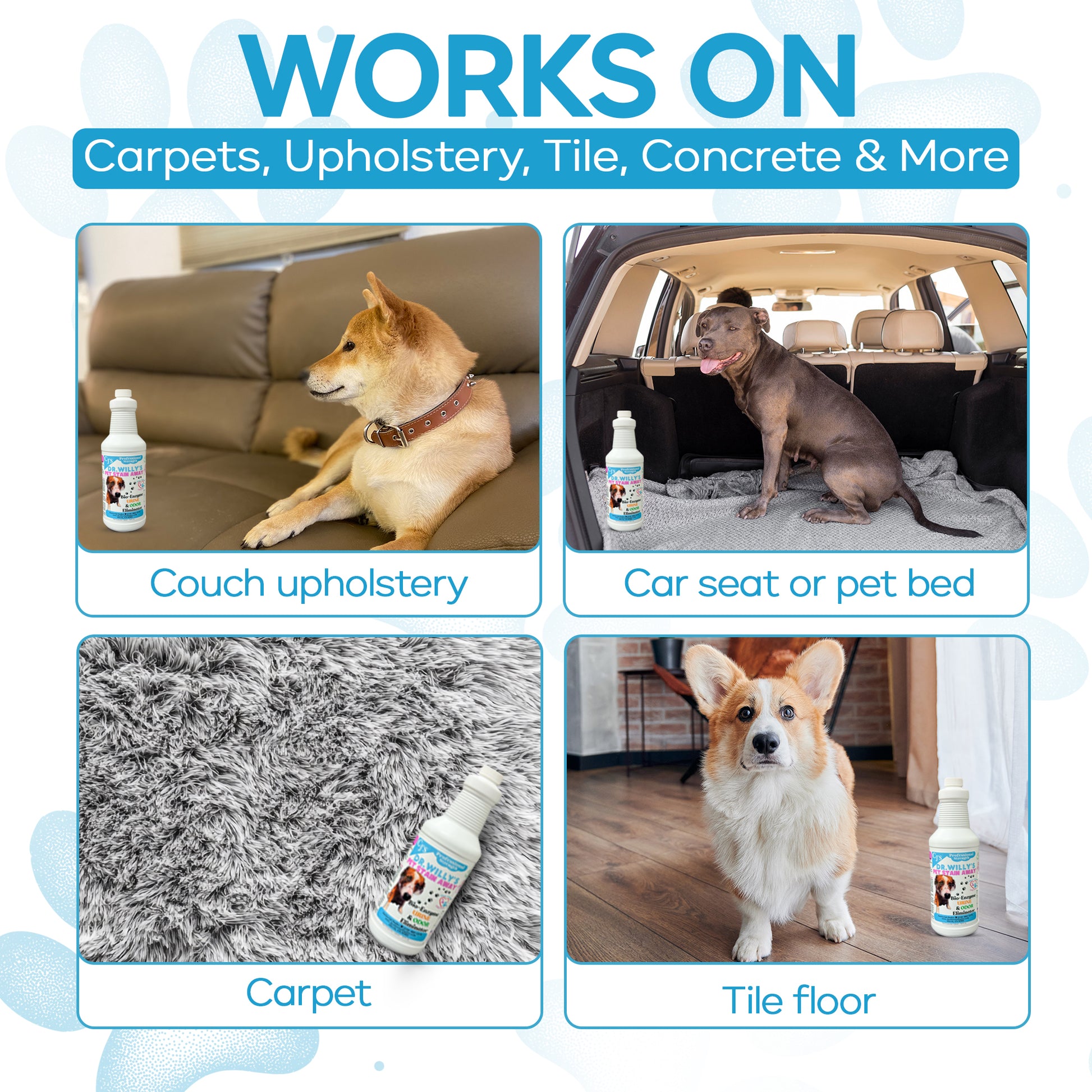 Meet Dr. Willy Pet Stain Away, your go-to solution for tackling tough pet stains and odors! Whether it’s urine, vomit, or other pet messes, this powerful enzyme-based cleaner breaks down organic matter at the source—leaving your carpets, upholstery, and hard surfaces fresh, clean, and odor-free.Featuring our adorable mascot Dr. Willy (because even messes deserve a little charm), this formula is safe for pets and kids when used as directed. It works fast, smells fresh, and doesn’t just mask odors—it eliminates them.Works Best On Carpet, Upholstery,Concrete, Toilets, Drains,Other Water-Safe & Porous Surfaces *Pairs Great with Carpet & Upholstery Machines